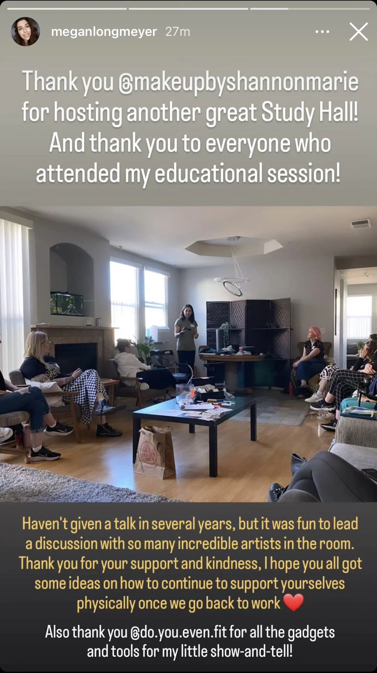 “Thank you @MakeupByShannonMarie for hosting another great Study Hall! And thank you to everyone who attended my educational session! It was fun to lead a discussion with so many incredible artists in the room. Thank you for your support and kindness, I hope you all got some ideas on how to continue to support yourselves physically once we go back to work. ”